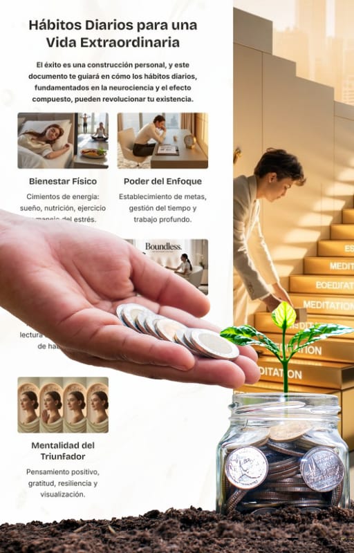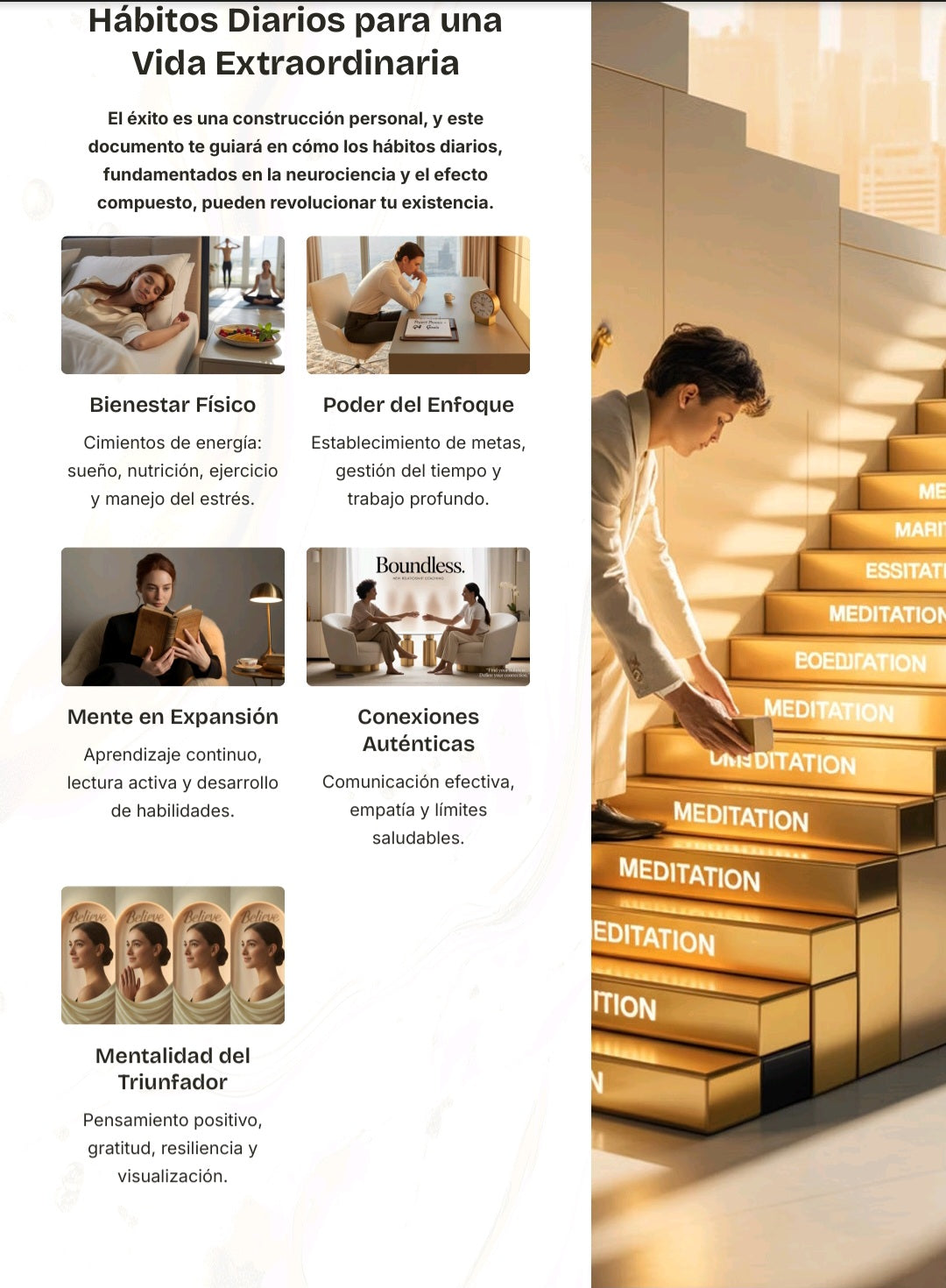 La respuesta no está en un golpe de suerte, sino en el poder de las acciones pequeñas y consistentes. En este ebook, te revelamos la ciencia y la práctica detrás de la creación de hábitos que realmente importan. No se trata de cambios drásticos, sino de integrar rutinas sencillas y poderosas que, con el tiempo, te guiarán hacia la vida que siempre has deseado.